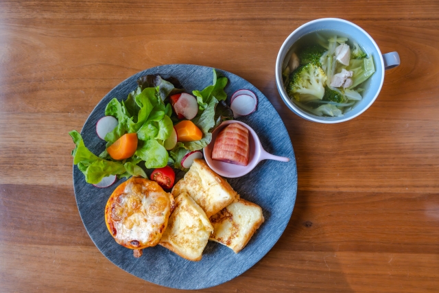 朝採れたての旬のお野菜を、彩り豊かにたっぷり盛り合わせました。 フレッシュな自家製オニオンドレッシングで。甘いフレンチトーストと本日の日替わりスープ付きで、お腹も満足。