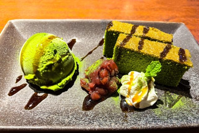 しっとりとした抹茶スポンジケーキに、お抹茶の甘苦いアイスやお手製小豆とフレッシュクリームを添えた色々な触感を楽しめる一皿です。日本の甘みを五感でお楽しみください。